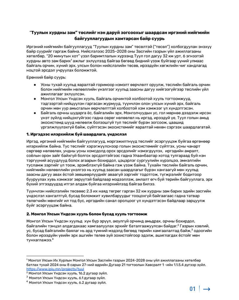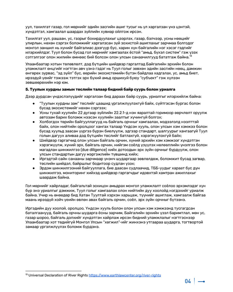 – Байгаль орчны шударга ёс, байгалийн эрх, ус, гол мөрнөө дээдэлж ирсэн үнэт зүйлд нийцэхгүйгээс гадна сөрөг нөлөөлөл нь иргэд, ирээдүй хойч үе, Туул голын амьд экосистемд шууд нөлөөлж болзошгүй тул төслийг бүрэн зогсоож, цаашид үргэлжлүүлэхгүй байж, сүйтгэсэн экосистемийг яаралтай нөхөн сэргээх шаардлагатай.