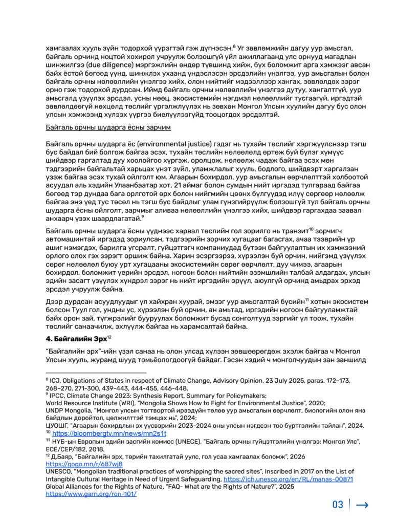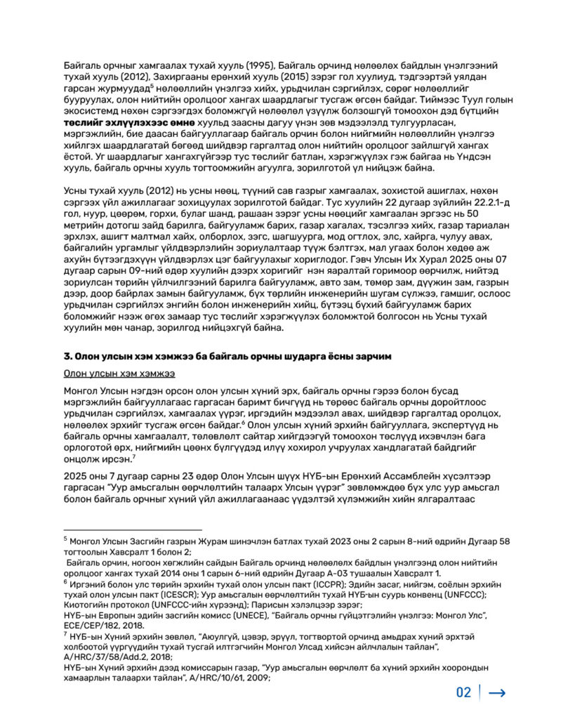 – Монгол Улсын Үндсэн хууль, Байгаль орчинтой холбоотой хууль тогтоомжууд, тэдгээртэй нийцүүлэн гаргасан журмууд, түүнчлэн олон улсын хүний эрх, байгаль орчин мөн уур амьсгалын өөрчлөлттэй холбоотой хэм хэмжээг үл хүндэтгэсэн.